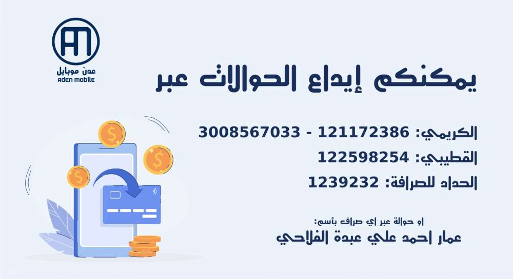 نحن لا نقوم ببيع او تأجير معلوماتك الشخصية الى الغير لأغراض التسويق الخاصة بهم , ويجوز لعدن موبايل الترويج لخدماتها عبر إعلانات ترويجية من خلال تطبيق عدن موبايل او موقع الويب الخاص yemenrobot.ye